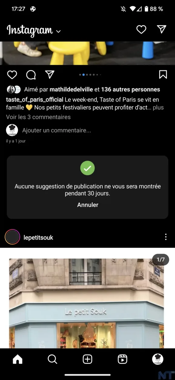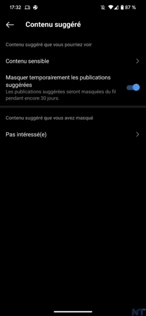 Une bannière s’affiche alors à l’écran, vous informant que toutes les publications suggérées seront masquées pendant 30 jours. Pour désactiver les publications suggérées dans les paramètres d’Instagram, procédez comme suit :