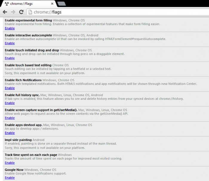 Beaufort avait déjà repéré une portion de code qui ajoute une option nommée “Show Google Now notifications in Chrome” au sein des navigateurs Chrome sur la page Chromium Code Reviews. Cette fois-ci, il a repéré le même code sur une version bêta du navigateur Chrome. Vous pouvez déjà activer l’option si vous avez le savoir-faire technique – plutôt simple puisqu’il vous suffit de vous rendre sur chrome://flags depuis le navigateur, et ce au sein de la dernière version Chromium pour Windows.