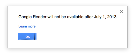 Vous le savez certainement déjà, mais Google a annoncé cette nuit que son service Google Reader fermera ses portes le 1er juillet 2013. À titre informatif et pour ceux qui l’ignorent Google Reader est un lecteur de flux d’information sur Internet, permettant la lecture des flux RSS et Atom. Pour ne pas trop laisser ses utilisateurs dans le néant, sachez que ces derniers seront en mesure d’exporter leurs abonnements et d’autres données pour une utilisation dans une alternative, en utilisant Google Takeout – au moins comme ça le processus se fait plus en douceur.