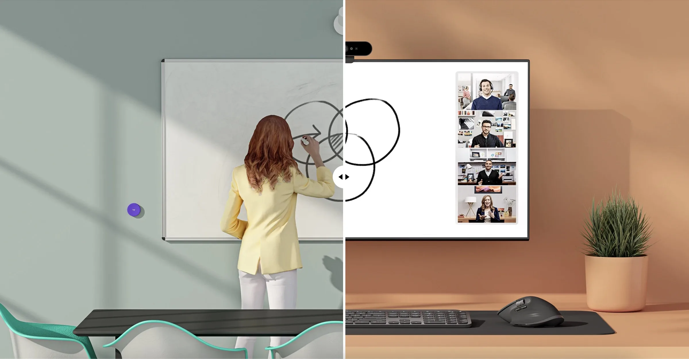 Cela représente l’émergence d’un nouveau type de caméra de contenu qui permet aux hôtes de présenter un tableau blanc physique sans que le présentateur bloque la vue d’une caméra placée au centre de la pièce — une caméra suspendue minimise cette distraction.