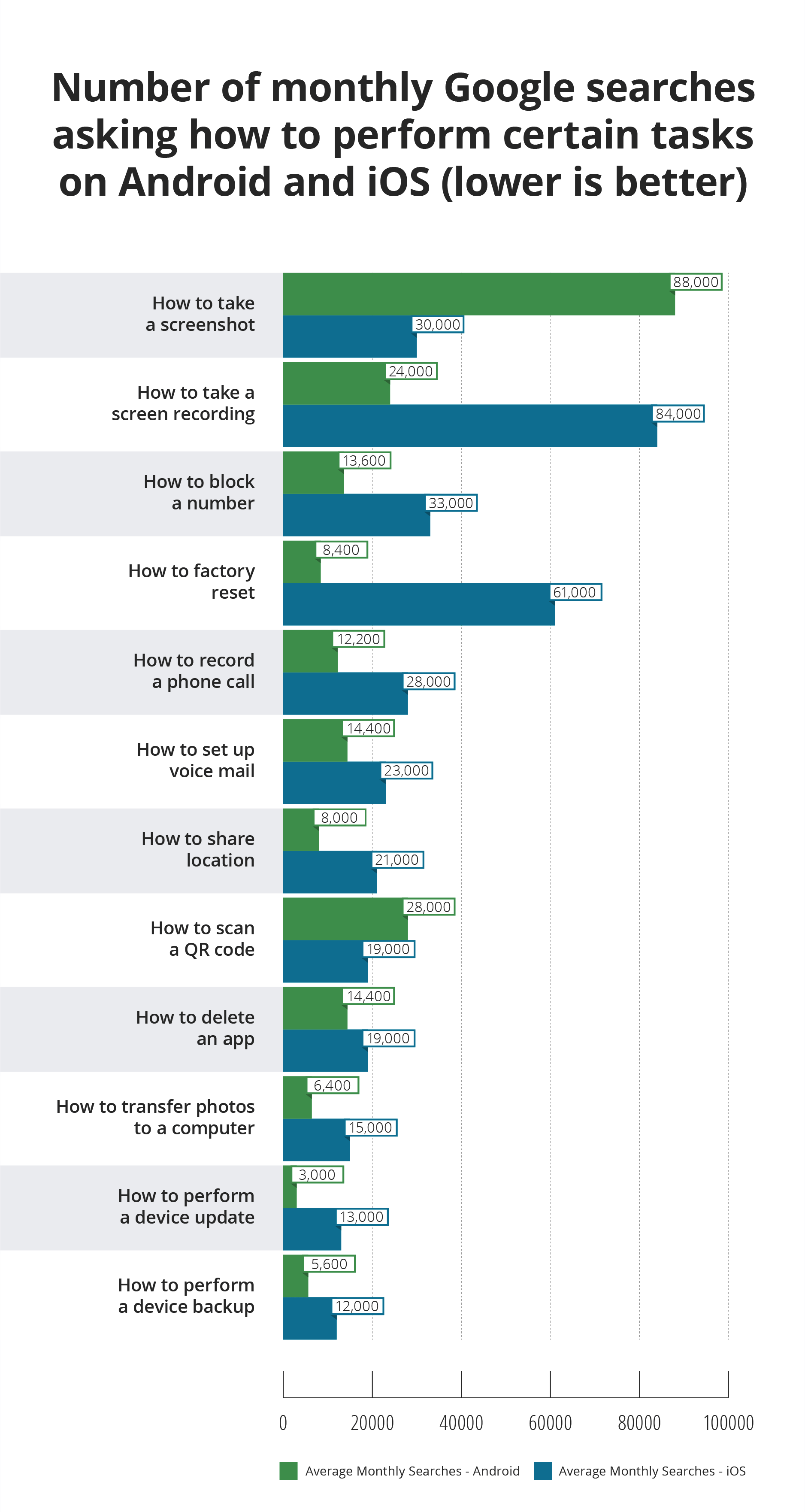 61 000 propriétaires d’iPhone saisissent le terme de recherche « Comment réinitialiser les paramètres d’usine » sur Google chaque mois, contre 8 400 propriétaires de smartphones Android. Parmi les autres tâches plus faciles sur Android que sur iOS figurent l’enregistrement d’un appel téléphonique, la configuration d’une messagerie vocale, le partage de l’emplacement, la suppression d’une application, le transfert de photos, la mise à jour d’un téléphone et la sauvegarde de l’appareil.