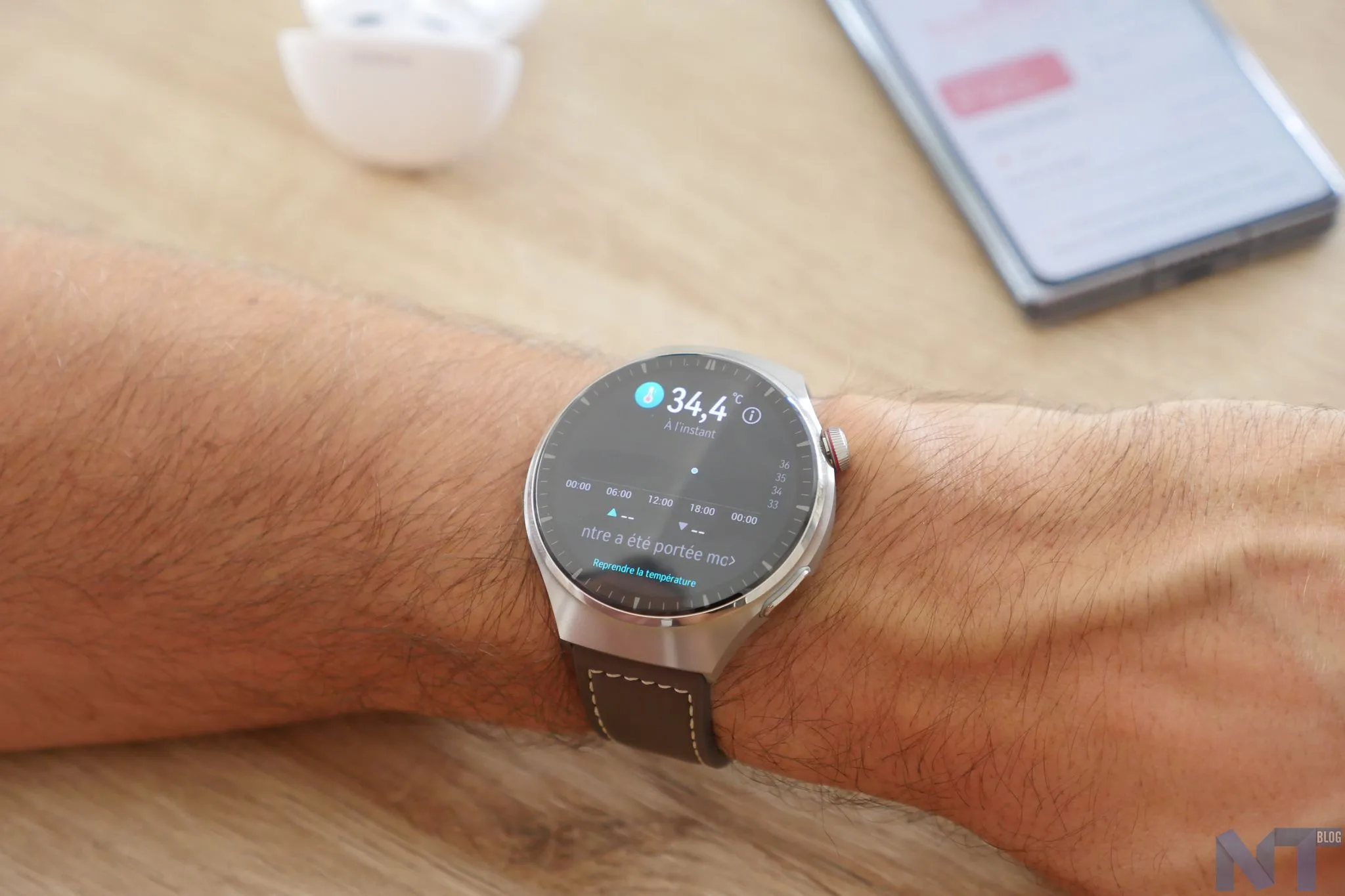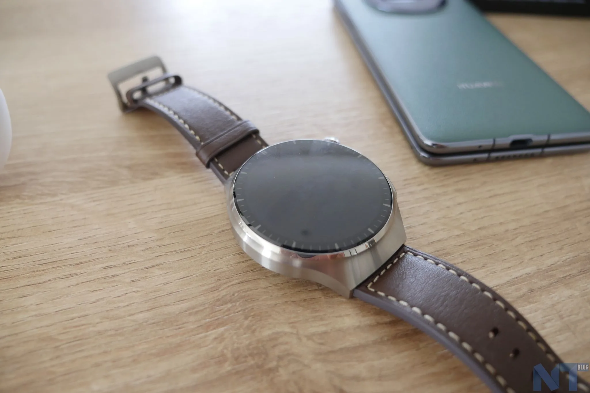 La Huawei Watch 4 Pro est disponible en deux versions : l’une avec un bracelet en cuir brun foncé et l’autre avec un bracelet en titane, qui est un peu plus lourd, plus résistant et plus cher. J’ai reçu la version en titane pour la tester.