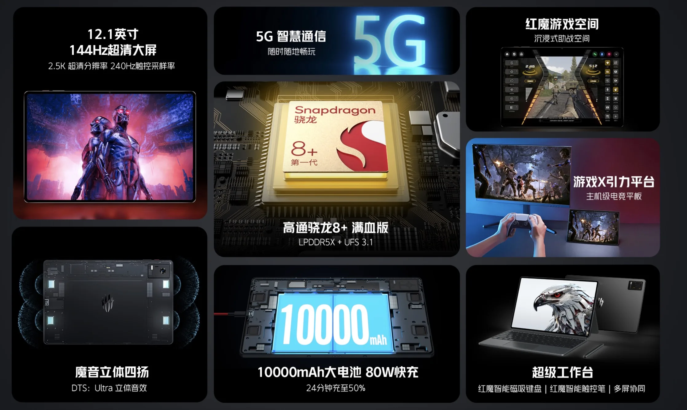 La tablette de jeu est équipée d’un puissant processeur Snapdragon 8+ Gen 1 de Qualcomm, couplé à une mémoire vive de 12 ou 16 Go et à un espace de stockage UFS 3.1 de 256 ou 512 Go. Tout comme la RedMagic 8S Pro, la tablette est équipée d’un système de refroidissement ICE Magic, mais pas dans sa version améliorée.