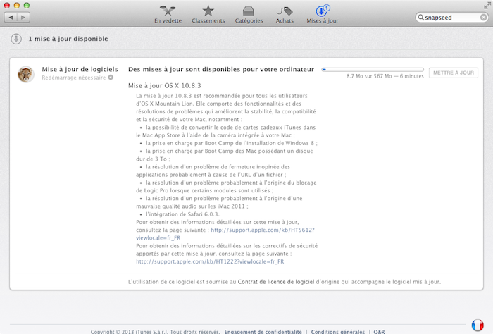 En général, il est bon d’appliquer les mises à jour logicielles (notamment s’il ne s’agit pas d’une mise à jour majeure) dès qu’elles sont disponibles. Non seulement elles vous aident à rester protégé contre les nouvelles menaces de sécurité, mais vous donne aussi accès à de nouveaux réglages système. Par exemple, en plus d’éradiquer les bugs, cette mise à jour vous permet également d’échanger des cartes cadeaux iTunes depuis l’App Store de Mac, et d’accroître le support de Boot Camp pour Windows 8, et contribue à ce que l’application Mail fonctionne mieux avec Exchange.