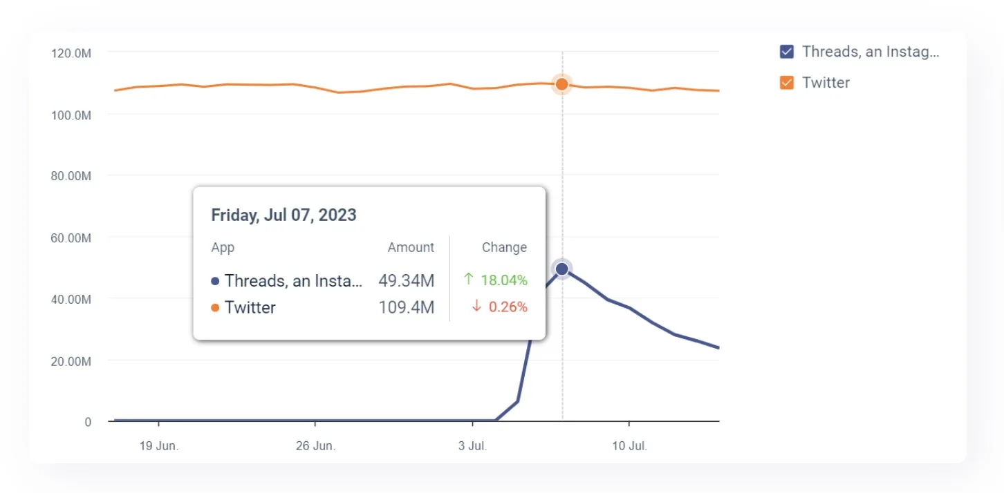 Lors de sa meilleure journée, le 7 juillet, quelques jours après son lancement, Threads, réel concurrent de Twitter, a dépassé les 49 millions d’utilisateurs actifs quotidiens sur Android dans le monde entier, mais le 14 juillet, ce chiffre avait déjà chuté de près de la moitié pour atteindre 23,6 millions, selon une étude réalisée par la société d’analyse SimilarWeb.