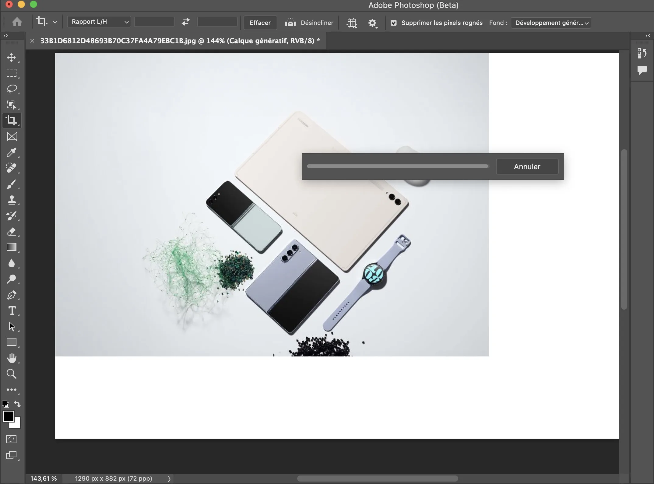 La fonction Remplissage génératif fait partie des fonctions Firefly d’Adobe qui sont désormais disponibles pour les bêta-testeurs de Photoshop. Grâce à cette fonctionnalité, vous pourrez compléter les détails manquants d’une image à l’aide de l’IA générative. Cette fonctionnalité fait partie du workflow de l’outil de recadrage dans Photoshop.