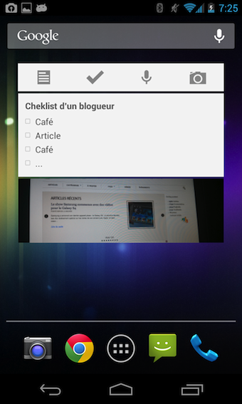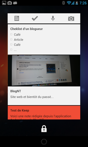 Ensuite, il ne semble pas y avoir d’alertes ou des notifications. Si vous voulez fixer un délai pour une note ou une tâche avec un rappel, vous allez probablement devoir patienter que Google sorte une deuxième version. D’un autre côté, l’application est dotée de deux nouveaux widgets avec des boutons pour un accès rapide. Il y a aussi une widget dédié à l’écran de verrouillage pour les appareils avec Android Jelly Bean 4.2 et plus.