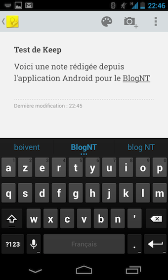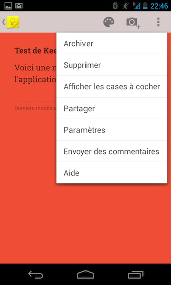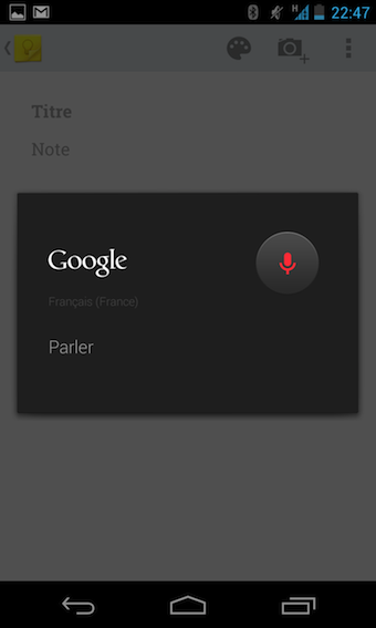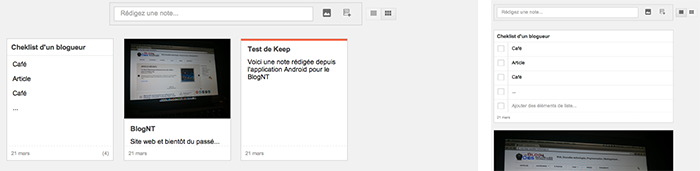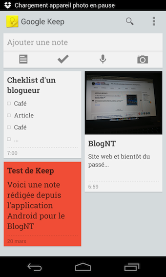 Essentiellement avec Google Keep vous allez être en mesure d’enregistrer vos tâches ou prendre des notes de plusieurs façons. Pour cette première version, la prise de notes est autorisée par l’intermédiaire d’une saisie clavier, de la dictée vocale, d’un son enregistré ou encore avec l’ajout de photos – à l’heure actuelle il vous sera impossible d’ajouter de la vidéo. De plus, autre contrainte concernant l’ajout des photos, celles-ci sont uniquement réservées à celles que vous êtes en train de prendre puisqu’il est impossible d’utiliser les images de la galerie – ou alors il vous faudra lancer la version Web sur votre mobile.
