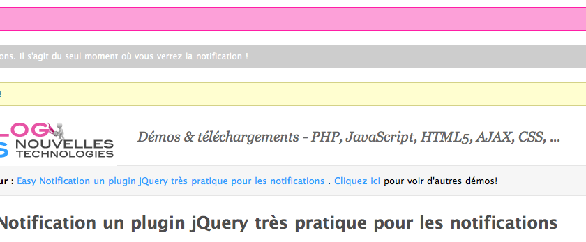 Il existe de nombreuses méthodes lorsque vous voulez transmettre un message aux utilisateurs sur votre site Web et que vous voulez vous assurez qu’ils vont le lire ou du moins l’apercevoir. C’est pour cette raison que je vais vous présenter un plugin jQuery (easyNotification) qui vous rendra cette tâche facile. Ce dernier permet de gérer différentes notifications comme nous allons le voir ci-dessous ainsi que sur la partie démo du blog.
