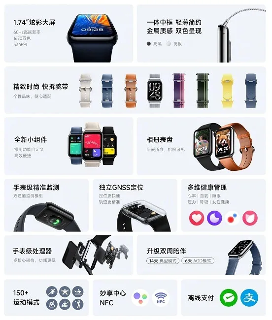- Surveillance de la santé : suivi continu de la fréquence cardiaque, suivi continu de la saturation en oxygène du sang, suivi du sommeil 24 heures sur 24, 7 jours sur 7, suivi de la santé féminine, etc.
