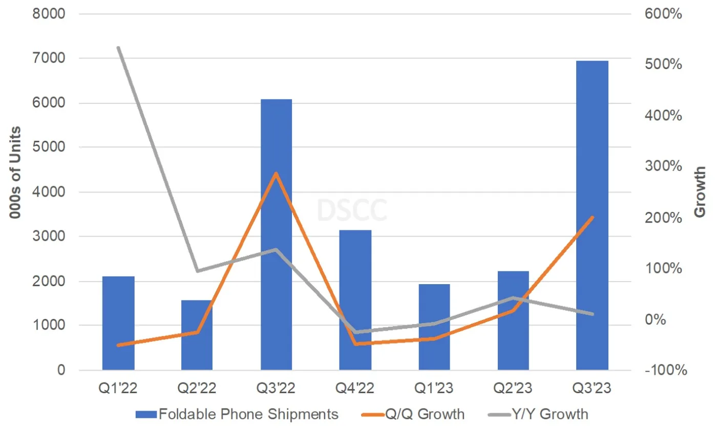 Le marché des smartphones pliables semble être le seul point positif de l’industrie des smartphones cette année. Selon DSCC (Display Supply Chain Consultants), au cours du deuxième trimestre de cette année, les ventes mondiales de smartphones pliables ont augmenté de 42 % en glissement annuel et de 16 % par rapport au premier trimestre de 2023, pour atteindre 2,2 millions d’unités.