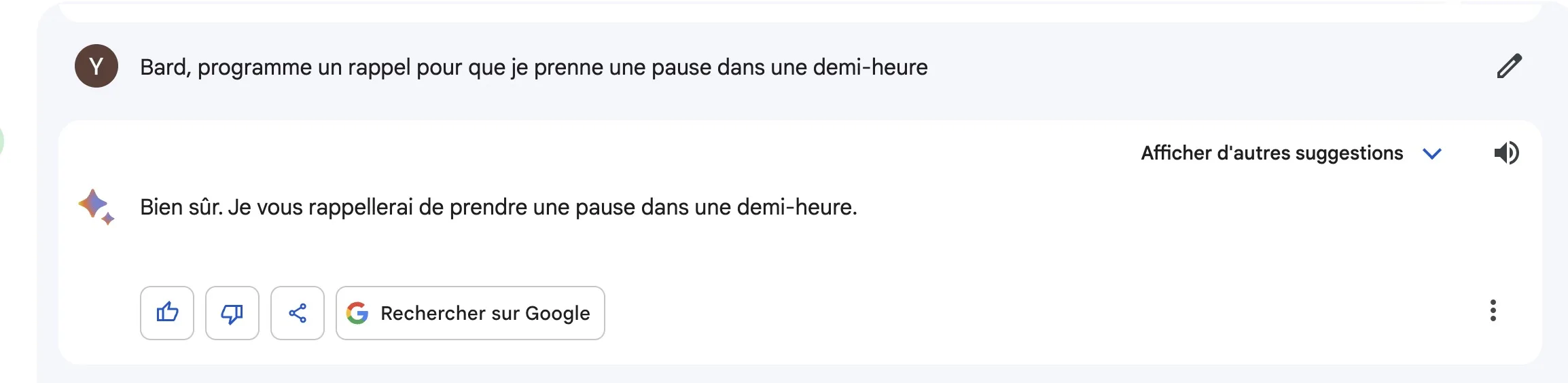 Pour intégrer les pauses dans votre routine à l’aide de Bard, l’interaction est simple, mais efficace. Vous pouvez lancer la fonction en disant : « Bard, programme un rappel pour que je prenne une pause dans une demi-heure ». Bard activera alors une minuterie de 30 minutes et vous préviendra lorsqu’il sera temps de vous éloigner de votre travail.