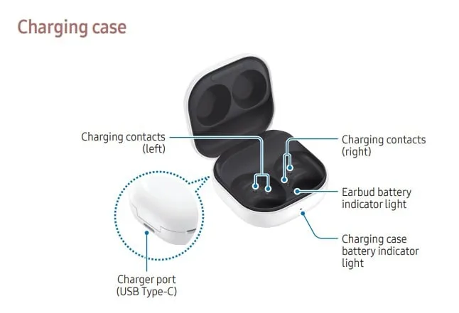 L’étui comporte des indicateurs de charge et de batterie à l’intérieur et à l’extérieur, ainsi que des contacts de charge pour les écouteurs. Une encoche permet également d’ouvrir l’étui. L’étui a une finition brillante, mais étant donné sa ressemblance avec les autres Galaxy Buds, vous pouvez facilement vous procurer un étui pour le protéger des rayures.