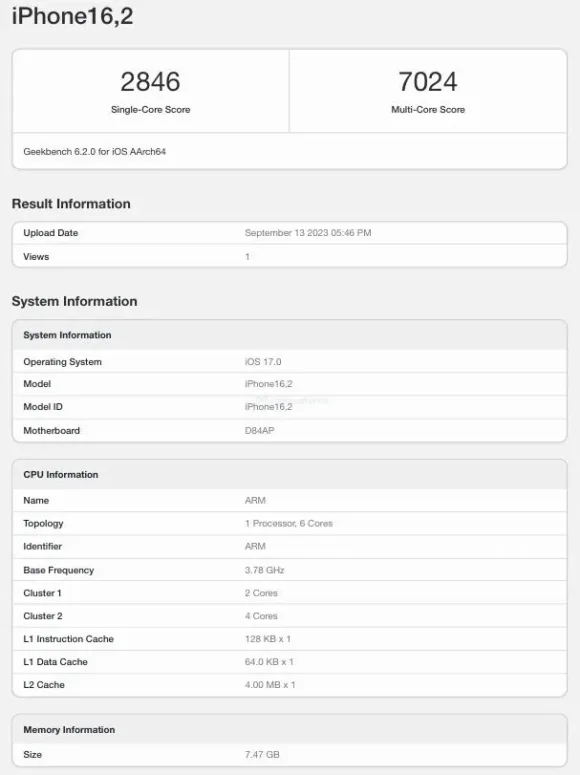 Il est intéressant de noter que ces benchmarks mentionnent également 8 Go de mémoire vive, soit 2 Go de plus que l’iPhone 14 Pro et Pro Max. Il est possible que ce détail soit erroné, mais la rumeur selon laquelle ces smartphones disposeraient de 8 Go de RAM s’est répandue avant le lancement de l’appareil. Malheureusement, ce n’est pas quelque chose qu’Apple révèle toujours, donc nous n’en aurons pas la certitude tant que quelqu’un ne les aura pas démontés.