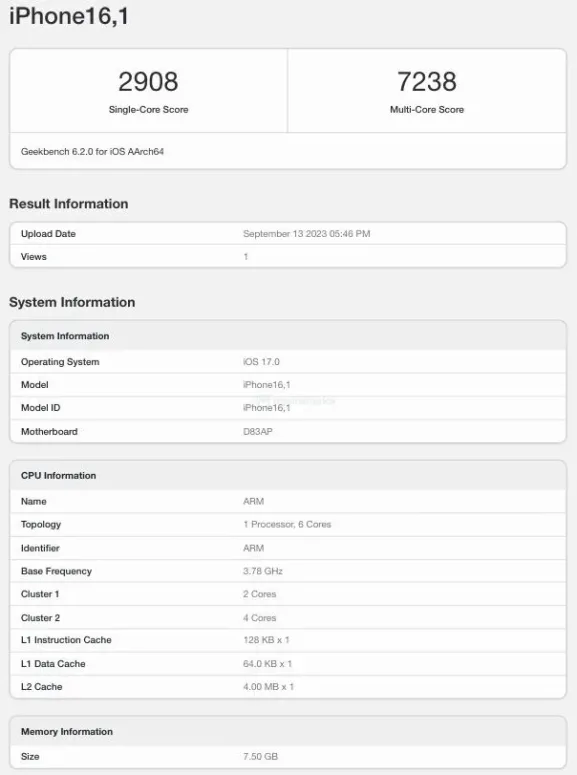 Initialement repéré par MySmartPrice, l’iPhone 15 Pro fait désormais l’objet de plusieurs listings Geekbench, et dans le dernier en date, il obtient un score de 2 914 points pour un seul cœur et un résultat de 7 199 points pour plusieurs cœurs. Notez que le smartphone est répertorié sous le nom « d’iPhone 16,1 », mais les détails du chipset indiquent clairement qu’il s’agit de l’un des nouveaux modèles Pro, et MySmartPrice affirme qu’il s’agit spécifiquement de l’iPhone 15 Pro.