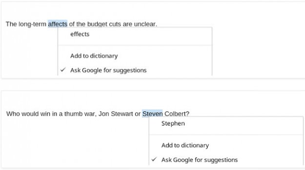 Cependant, ce que vous allez voir débarquer est plutôt sympa, puisqu’une nouvelle fonctionnalité vient enrichir la vérification orthographique dans le navigateur. Le “Ask Google for suggestions” peut maintenant vérifier les erreurs grammaticales, les noms propres mal orthographiés et en minuscule. Il peut même détecter des homonymes et faire un peu de vérification orthographique contextuelle. Par exemple – en anglais, il vous dira si vous avez besoin d’utiliser “affect” au lieu de “effect”, ou vice-versa. Hélas ces nouveautés sont à l’heure réservées uniquement aux utilisateurs anglophones…