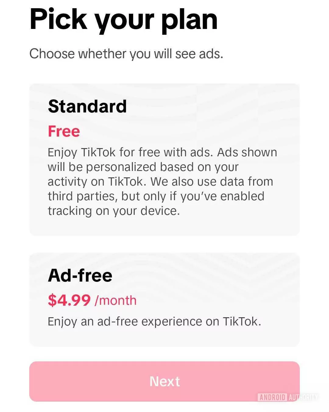 Android Authority a obtenu des captures d’écran de TikTok invitant les utilisateurs à choisir entre rester sur la version gratuite de l’application avec des publicités ou passer à une expérience sans publicité. Selon la capture d’écran, certains utilisateurs ont la possibilité de payer 4,99 dollars par mois pour ne pas voir les publicités.
