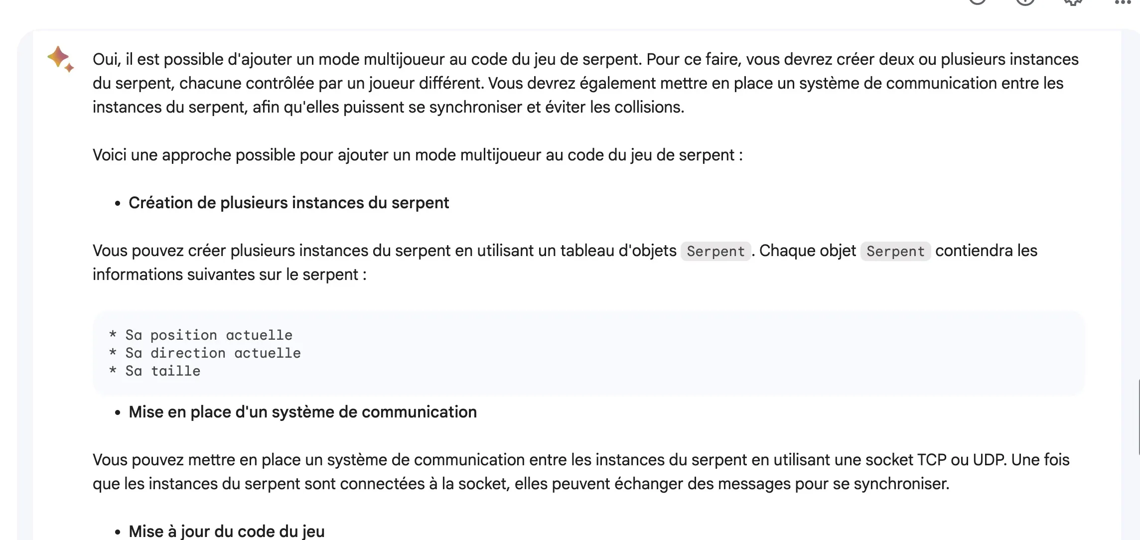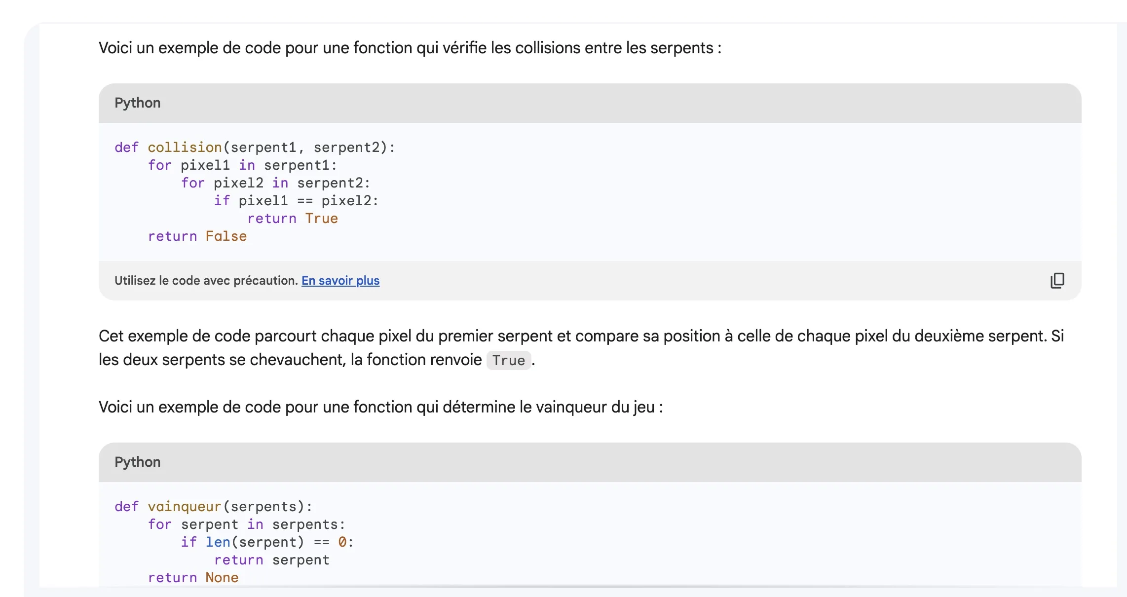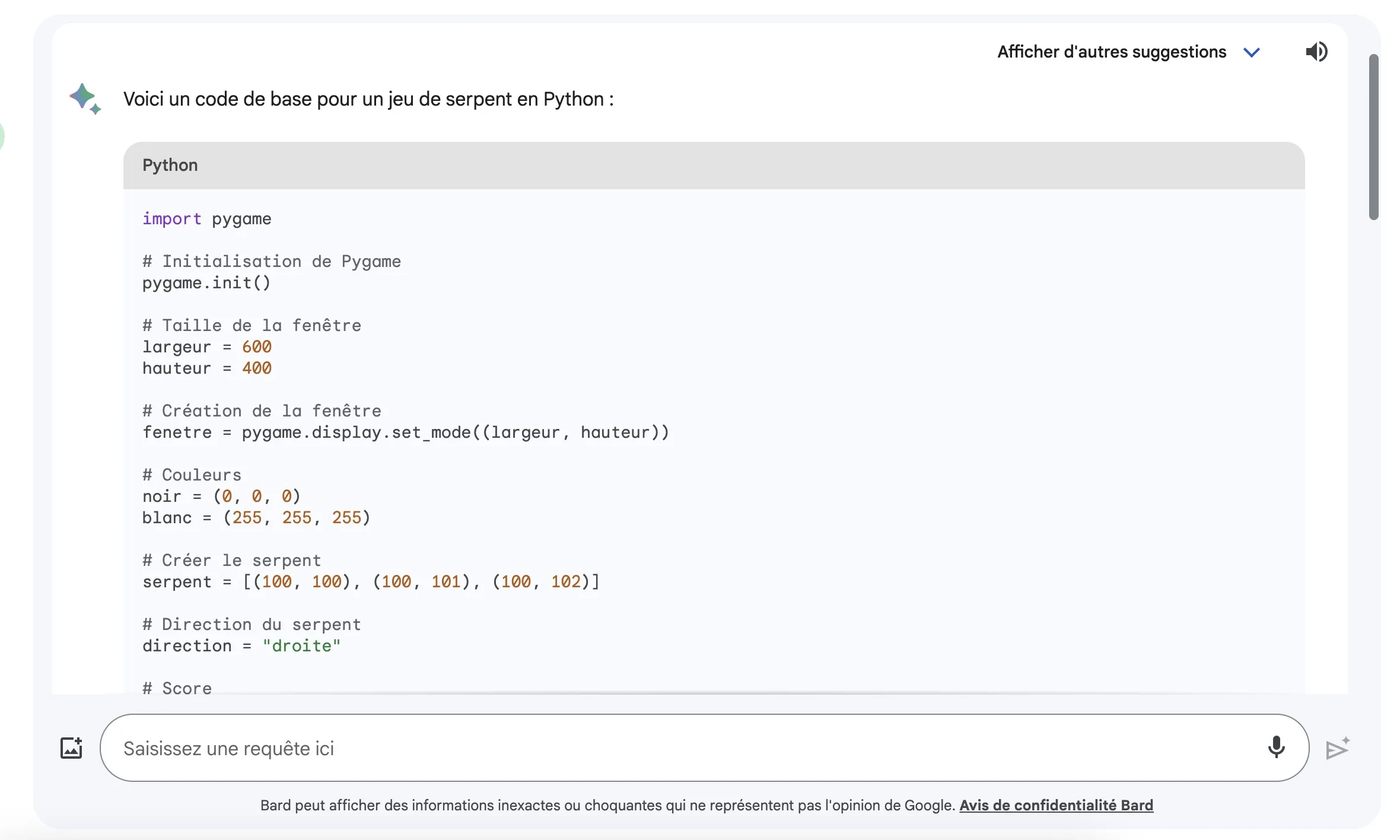 - Ensuite, demandez à Bard de générer des extraits de code pour les différents éléments du jeu. Ces éléments peuvent inclure, sans s’y limiter : l’objet serpent qui représente l’entité contrôlée par le joueur, l’objet nourriture qui sert d’objet à collectionner dans le jeu, la boucle du jeu qui contrôle le flux des événements du jeu, et la fonction d’affichage responsable du rendu des graphismes du jeu. Essentiellement, vous cherchez à déconstruire le jeu en ses éléments constitutifs et à demander à Bard de générer du code pour chacun d’entre eux