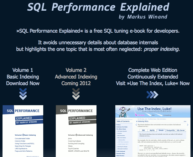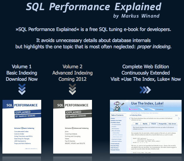 Pour vous aider dans cette démarche, SQL Performance explique dans un eBook libre, destiné aux développeurs, comment construire vos applications utilisant une base de données et l’optimiser au mieux. Il évite les détails inutiles au sujet interne des bases de données mais souligne le sujet qui est le plus souvent négligé : l’indexation appropriée.
