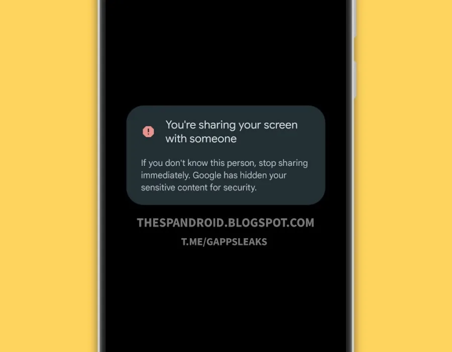 Dans ce déploiement, qui semble être limité à un petit nombre d’utilisateurs (peut-être dans le cadre d’un test a/b), ce qui apparaît lorsque l’on tente de partager son écran alors que l’application Google Messages est ouverte est une fenêtre contextuelle indiquant « Vous partagez votre écran avec quelqu’un. Si vous ne connaissez pas cette personne, arrêtez immédiatement le partage. Google a masqué votre contenu sensible pour des raisons de sécurité ». Pendant ce temps, l’application continue de fonctionner en arrière-plan et les notifications continuent d’arriver, mais le reste de l’application est masqué et la fenêtre contextuelle ne peut pas être supprimée tant que vous continuez à partager votre écran.