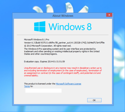 ZDNet a remarqué que Roman L. (@AngelWZR sur Twitter) a posté un lien et une capture d’écran d’une récente version en développement de Windows Blue indiquant le nom supposé de la mise à jour logicielle qui serait Windows 8.1. Cette image est initialement apparue sur un fil de discussions de Windows Blue sur WinForum.eu. Vous pouvez clairement voir que la capture d’écran fait référence à la version Windows 8.1 build Pro 9375, qui doit être la dernière version puisque les screenshots qui ont fuité la semaine dernière mentionnaient qu’il s’agissait de la build 9364.