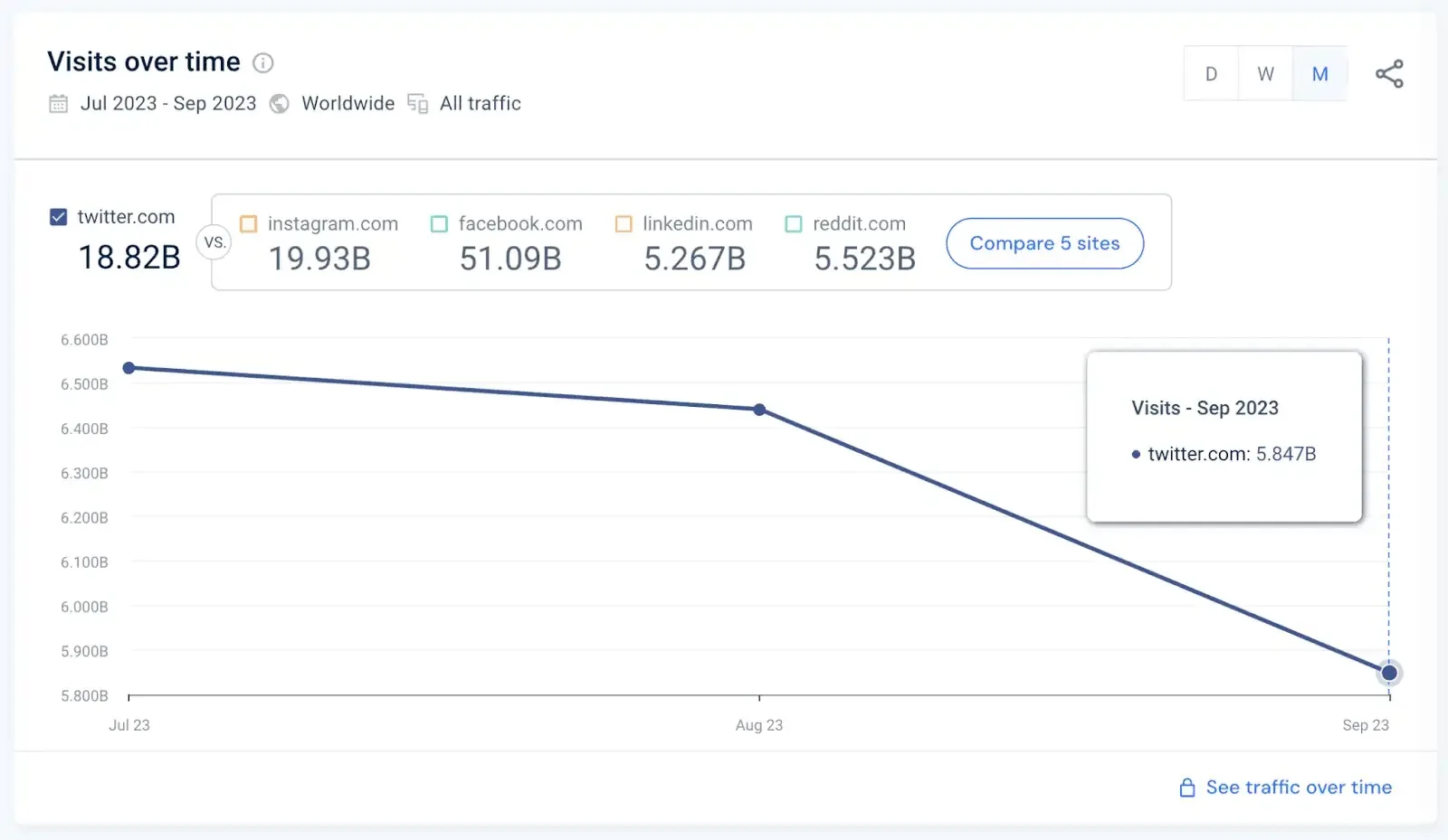 Les données proviennent de SimilarWeb, une société qui suit les visites de la plupart des sites Web. Selon ces données, X est passé de 6,4 milliards de visiteurs en août à 5,8 milliards en septembre. Ce n’est pas un nombre énorme de visiteurs perdus, mais cela représente tout de même une baisse de près de 10 %, ce qui n’est pas négligeable non plus.