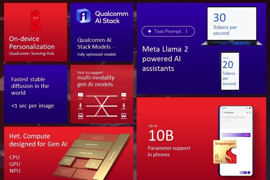 Le Snapdragon 8 Gen 3 est la première plateforme de l’entreprise à être conçue avec l’IA générative à l’esprit. Qualcomm permettra aux utilisateurs de générer un contenu unique, ce qui stimulera la productivité et d’autres cas d’utilisation. Qualcomm explique que ces nouvelles fonctionnalités d’IA peuvent être utilisées pour « les modèles de langage de grande taille (LLM), les modèles de vision du langage (LVM) et la reconnaissance vocale automatique (ASR) basée sur un réseau de transfert, jusqu’à 10 milliards de paramètres, uniquement sur l’appareil ».
