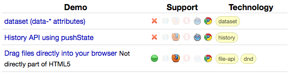 Ce site donne quelques exemples de ce qui peut être fait avec HTML5. Plusieurs informations vous sont affichées : le support, indiquant quels navigateurs prennent en charge la fonctionnalité, et le type de technologie utilisé pour celle-ci. En cliquant sur le lien d’une démo dans la liste, vous serez redirigé vers la démonstration.