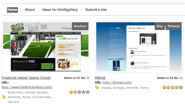 Ici, vous trouverez une vitrine des différents sites qui ont déjà mis en œuvre la nouvelle spécification. Vous trouverez une courte description de chaque site et quelles fonctions d’HTML5 sont principalement utilisées. Vous pouvez cliquer sur le lien pour visiter le site lui-même et ensuite utiliser votre navigateur pour afficher le code source.