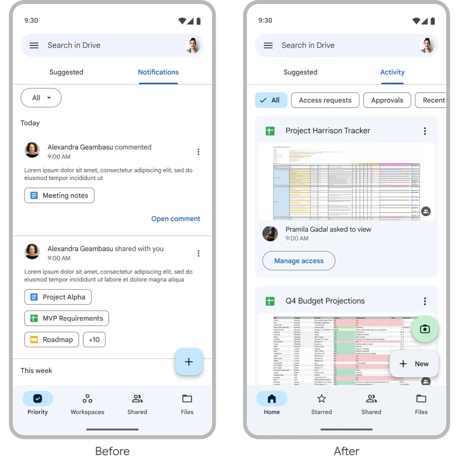 Mais ce n’est pas tout ! L’onglet « Notifications » sera désormais un flux « Activité », un changement qui a été récemment introduit pour les utilisateurs sur le Web. Cet onglet est réservé aux clients de Workspace et est principalement destiné au travail collaboratif ; la vue “Activité” vous montrera tous les fichiers qui ont récemment fait l’objet de commentaires, de demandes d’accès ou de demandes d’approbation. La vue “Activité” comprend notamment une rangée de filtres de recherche qui étaient auparavant cachés derrière un menu déroulant.