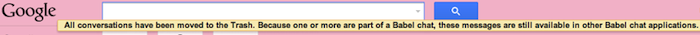 Hier, Patric Dhawaan a remarqué qu’en supprimant des messages sur sa boîte de réception Gmail, un message d’avertissement particulier s’affichait. Celui-ci caractérisé par la fenêtre de message de Google, affiché ci-dessous, indique que toutes ses conversations ont été placées dans la corbeille, mais que certaines étaient encore disponibles dans d’autres applications Babel. Cela pourrait signifier que Patric discutait avec quelqu’un qui utilisait un service en interne chez Google, probablement une application reliée à Babel, ou que ce message deviendra prochainement une procédure standard lors de la suppression de conversations.