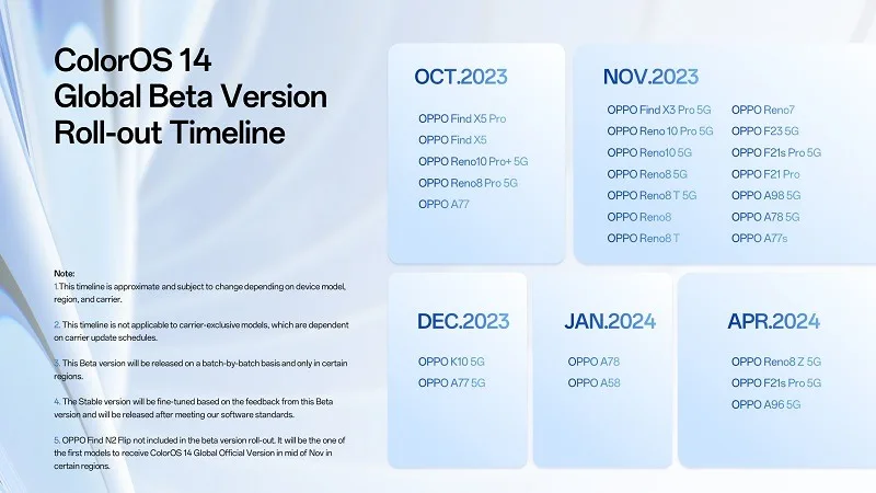 OPPO n’a pas encore confirmé quand exactement les versions stables de la mise à jour ColorOS 14 atteindront les autres smartphones de OPPO. Cependant, la société avait déjà parlé de la version bêta mondiale de ColorOS 14 et avait même fourni un calendrier de déploiement pour celle-ci. Comme mentionné, le Find N2 Flip est le premier à recevoir une version stable de ColorOS 14.