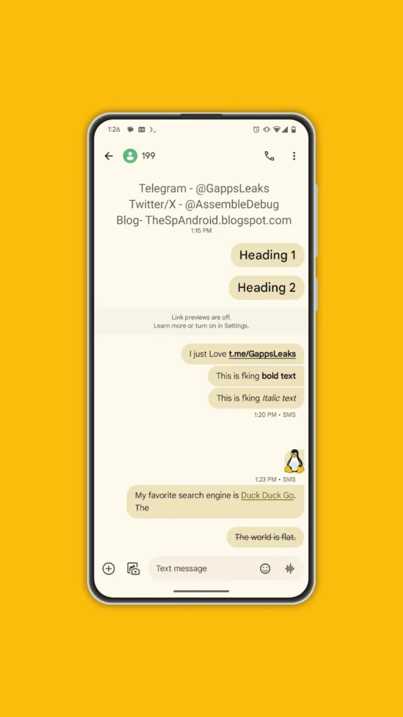 Malheureusement, lors des tests d’AssembleDebug, la syntaxe Markdown n’a pas toujours fonctionné. Par exemple, les listes, les tableaux et les guillemets ne sont pas pris en charge, mais les syntaxes de base telles que les en-têtes, le gras, l’italique et le barré semblent fonctionner. De plus, la fonctionnalité fonctionne aussi bien pour les SMS que pour les chats RCS, il est donc bon de savoir que personne ne sera laissé de côté.