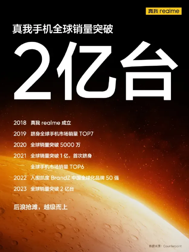 Selon les données de Counterpoint Research, realme, qui fait partie de la famille BBK Electronics avec OPPO et vivo, a atteint cette étape. Parmi tous les fabricants de smartphones, seuls vivo, HUAWEI, Samsung et Apple ont atteint la barre des 200 millions en moins de temps. Au total, seules 14 entreprises ont livré plus de 200 millions de smartphones dans le monde.