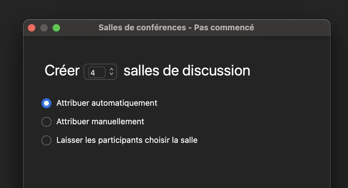 Ici, vous avez la possibilité de spécifier le nombre de salles nécessaires et d’indiquer si vous préférez une affectation automatique ou manuelle des participants.