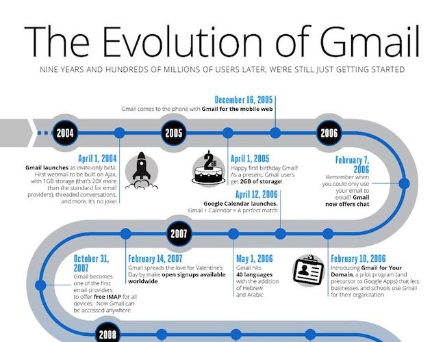 Pouvez-vous croire que Gmail a 9 ans ? Je n’ai pas senti cette vieillesse depuis la semaine dernière, lorsque Twitter m’a informé que c’était le 19ème anniversaire de la mort de Kurt Cobain. Aïe. Quoi qu’il en soit, Gmail a maintenant officiellement 9 ans, après que le populaire service de mails ait été lancé en version bêta le 1er avril 2004. Pour célébrer cela, Google a publié une infographie qui traite de l’évolution du produit.