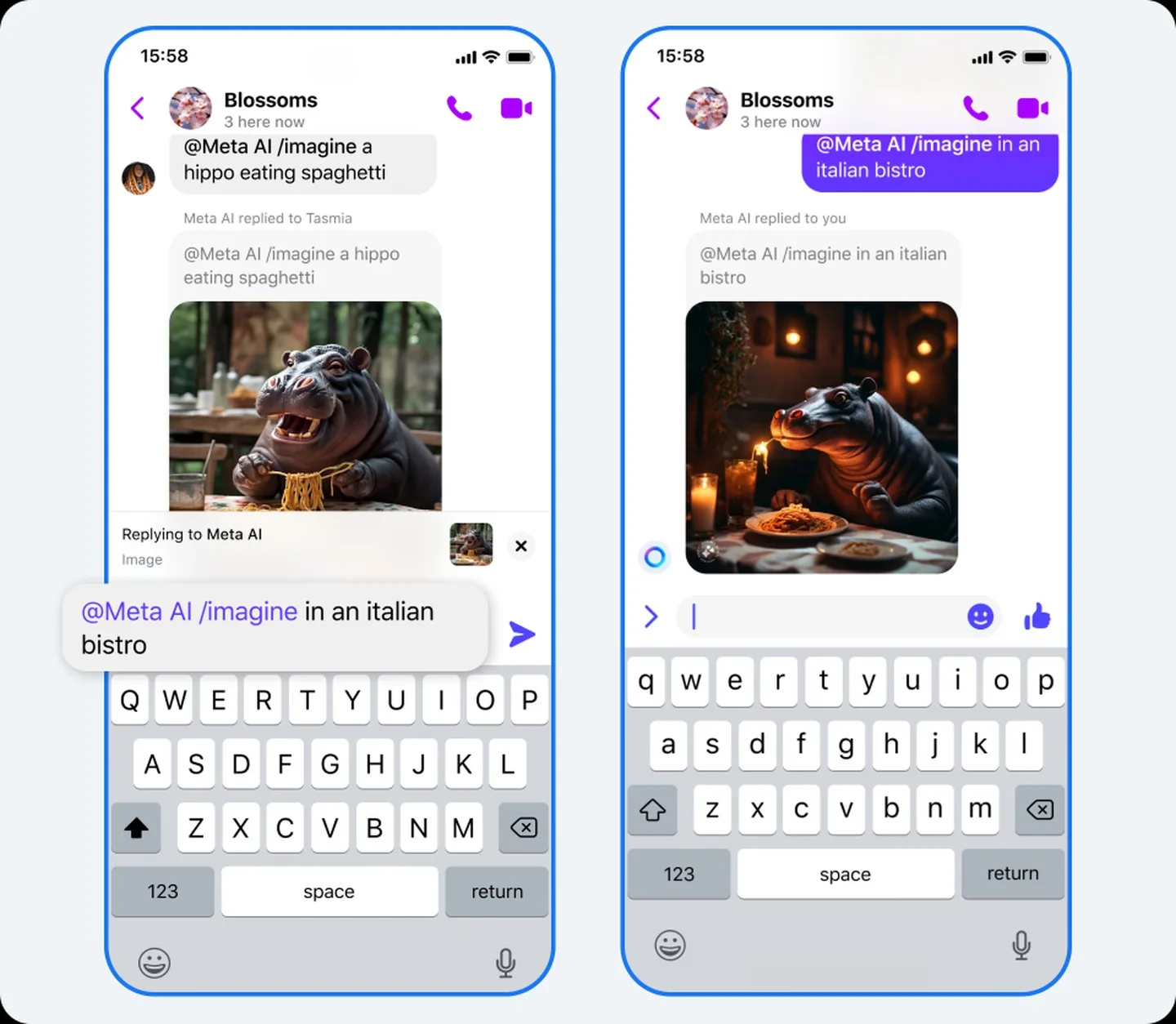 L’une d’entre elles est alléchante : un outil qui vous permettra de remixer des images générées par l’IA que vos amis partagent dans un chat Messenger ou Instagram. Les images sont créées à l’aide d’un outil que Meta appelle « imagine », et l’entreprise explique que vous pourrez désormais « réimaginer » les images créées par d’autres personnes dans le chat de groupe en appuyant sur l’image et en la maintenant enfoncée, puis en ajoutant un texte d’incitation.
