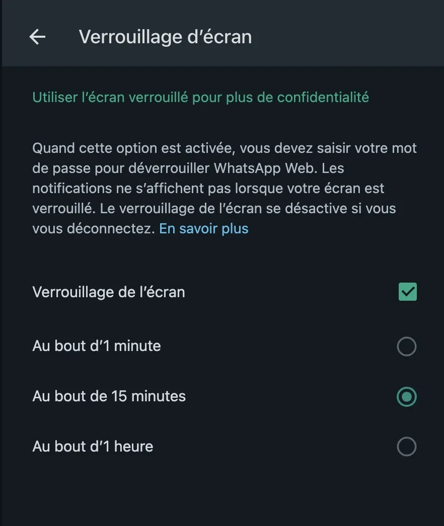 - Ensuite, sélectionnez le délai (1 minute, 15 minutes ou 1 heure) pour l’activation automatique du verrouillage de l’écran en cas d’inactivité. Cette durée correspond au temps pendant lequel WhatsApp Web reste ouvert dans un onglet du navigateur sans aucune interaction de la part de l’utilisateur. Si vous fermez WhatsApp Web, le verrouillage sera appliqué instantanément.