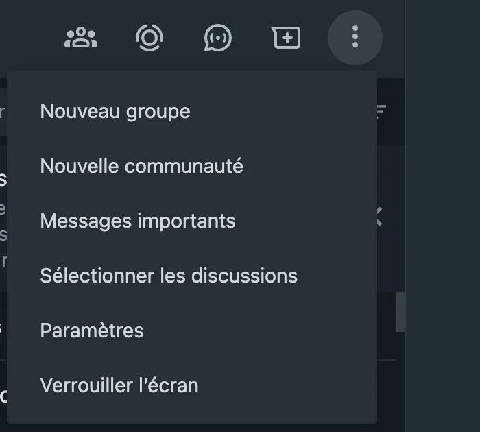 - Pour activer le verrouillage de l’écran sur WhatsApp Web, cliquez sur les trois points verticaux dans le coin supérieur droit de votre liste de discussions et ouvrez « Paramètres ».