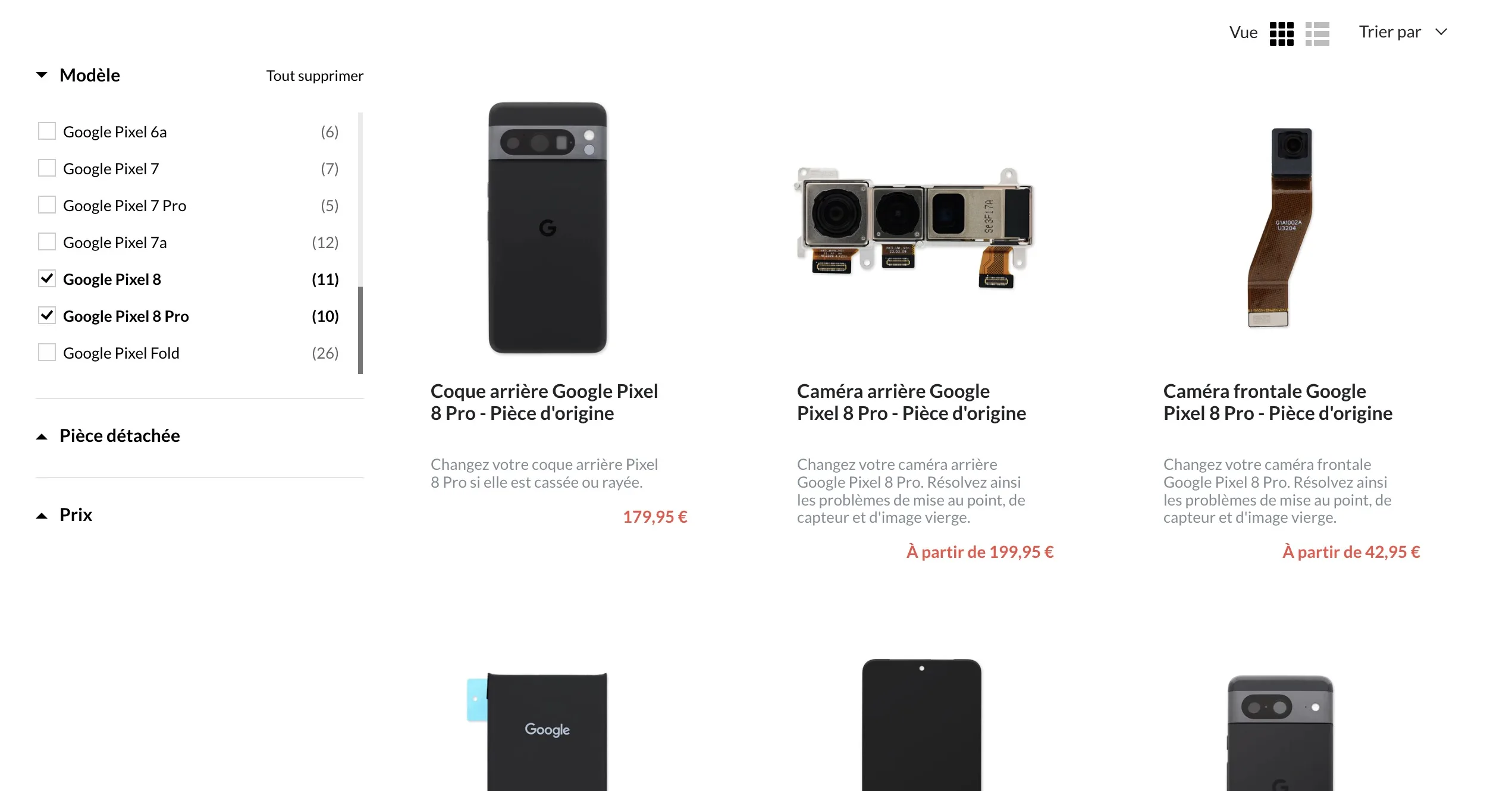 Comme on peut le voir sur le site d’iFixit, les pièces de réparation des Pixel 8 et 8 Pro sont plus chères que celles des Pixel 7 et 7 Pro, ce qui reflète le coût plus élevé des composants et la difficulté accrue du processus de réparation. Par exemple, l’écran du Pixel 8, qui a un taux de rafraîchissement de 120 Hz et une luminosité plus élevée, coûte 20 euros (à ce jour) de plus que l’écran du Pixel 7, qui a un taux de rafraîchissement de 90 Hz et une luminosité plus faible.