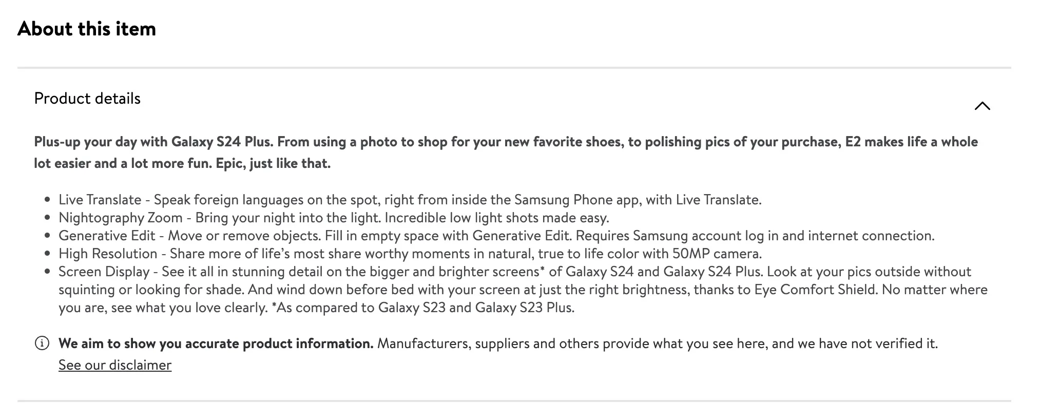 L’un des plus grands revendeurs américains, Walmart, a accidentellement listé le Galaxy S24 avant son lancement et nous a apporté davantage d’informations sur la série Galaxy S24. Le listing du Galaxy S24+ contient des détails sur la variante avec 256 Go de stockage, 12 Go de RAM et un écran 2K de 6,7 pouces.