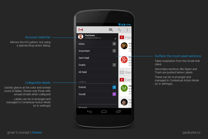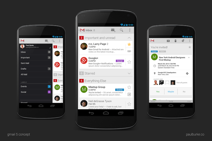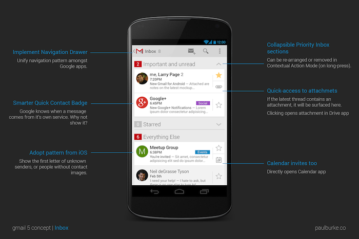 Néanmoins, c’est exactement sur ce point que le designer Paul Burke a travaillé, en tentant de montrer ce à quoi Gmail pourrait ressembler si la firme de Mountain View se penchait sur son cas, et notamment par rapport à “l’ère Google Now” que Google tente de créer.