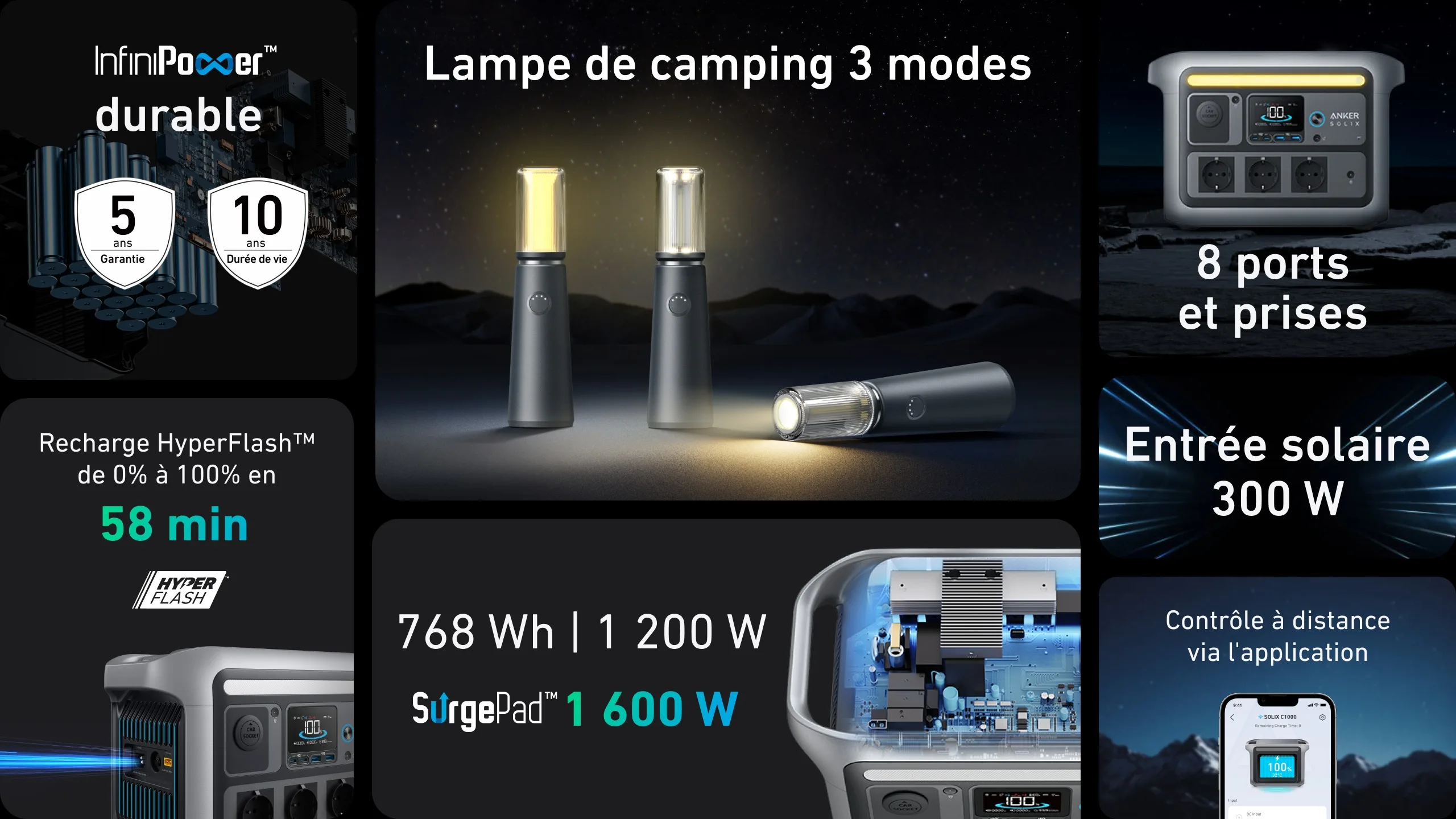 En ce qui concerne les spécifications, la Anker C800 Plus embarque une grande batterie LiPO4 de 768 Wh (1 200 W) qui dure plus de 3 000 cycles de recharge. Comme les autres stations électriques de la marque, vous bénéficierez de 5 prises de courant alternatif 120V pour alimenter de gros appareils ou des appareils électroménagers, ainsi que de deux ports USB-C et de deux ports USB-A, d’un port de cigarette DC et d’une barre lumineuse de camping LED intégrée à 3 niveaux.