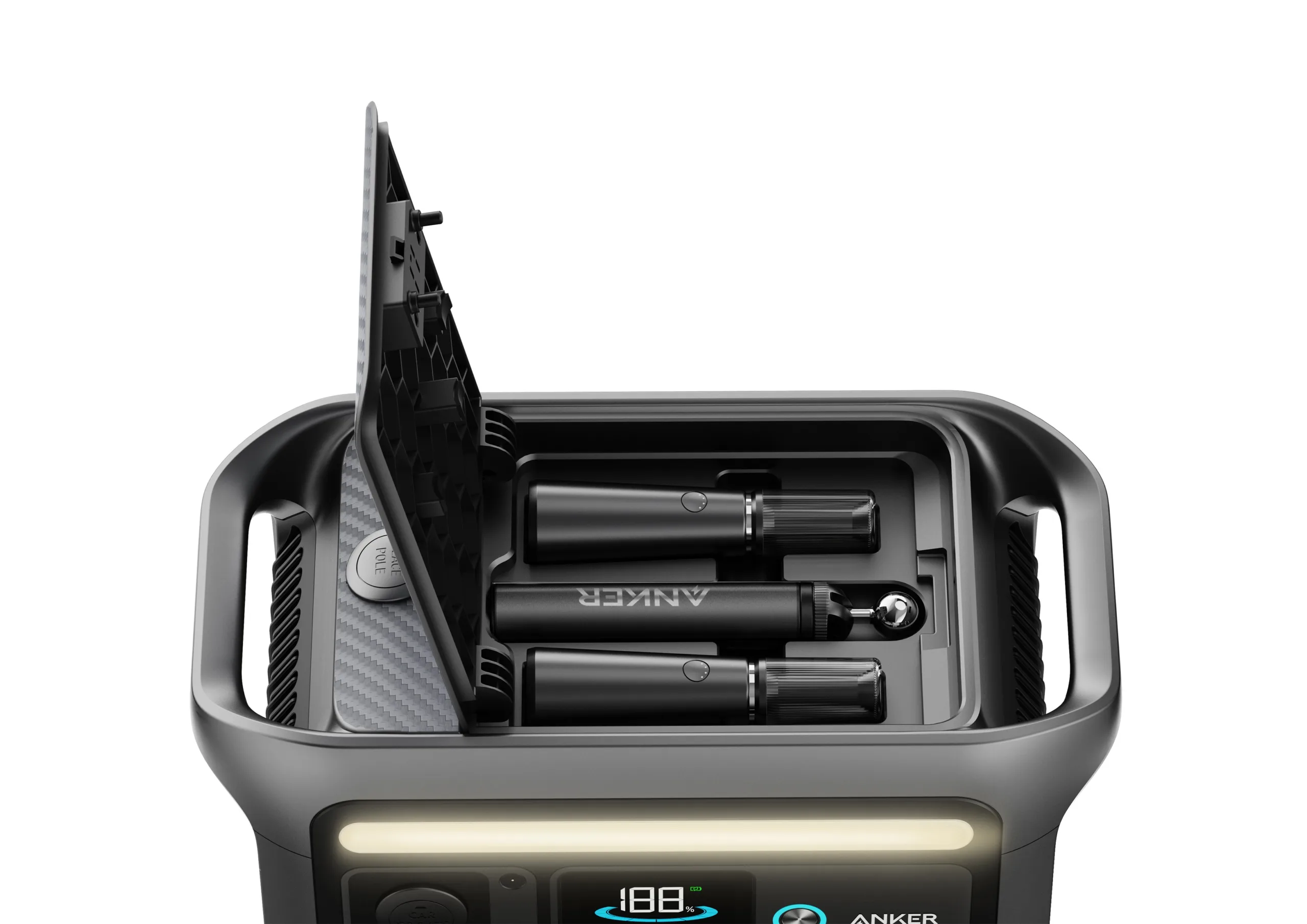 Faisant partie de la série camping d’Anker, la partie supérieure de la SOLIX C800 Plus sert également de compartiment de rangement où vous trouverez des accessoires parfaits pour tout camping ou toute aventure en plein air. À l’intérieur, il y a une perche télescopique que les propriétaires peuvent étendre à plus de 0,91 m, puis attacher une lanterne alimentée par batterie, suspendre des vêtements ou des lumières LED, et il se double d’une perche de selfie ou d’un trépied.