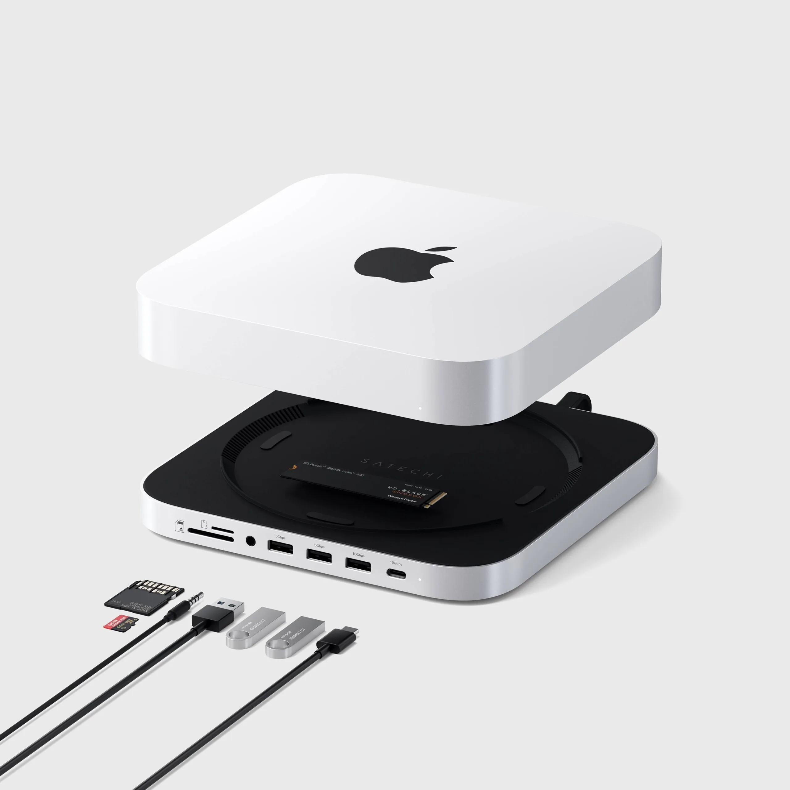 Satechi a également annoncé une nouvelle version du « Stand & Hub for Mac Mini and Mac Studio » (photo ci-dessus) qui, comme son nom l’indique, est un hub Thunderbolt spécialement conçu pour les Mac Mini et Mac Studio d’Apple. Il s’adapte parfaitement sous le Mac, ajoutant des ports en façade et un stockage NVMe caché pour plus de stockage. Le hub dispose d’un port USB Type-C 3.1, d’un connecteur USB Type-A 3.1, de deux ports USB Type-A 3.0, d’emplacements pour cartes SD et microSD et d’une prise audio, le tout alimenté par une seule connexion Thunderbolt au Mac. C’est un excellent moyen d’accroître la connectivité d’un Mac Mini ou d’un Mac Studio sans s’encombrer d’un hub ou de câbles supplémentaires à côté de l’ordinateur.