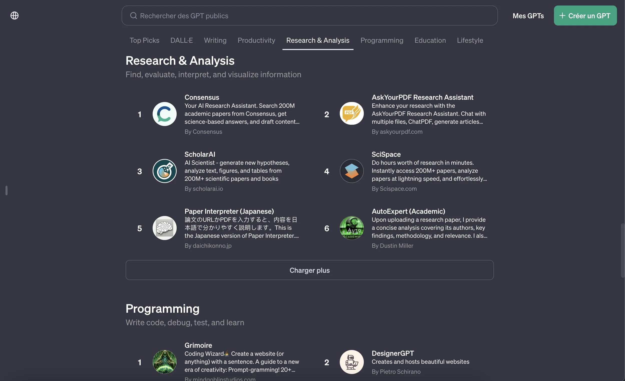 Vous pouvez rechercher les noms des GPT ou des fonctions dans la barre de navigation, ou parcourir des sujets tels que l’écriture, la productivité, la recherche et l’analyse, la programmation, l’éducation et le style de vie.