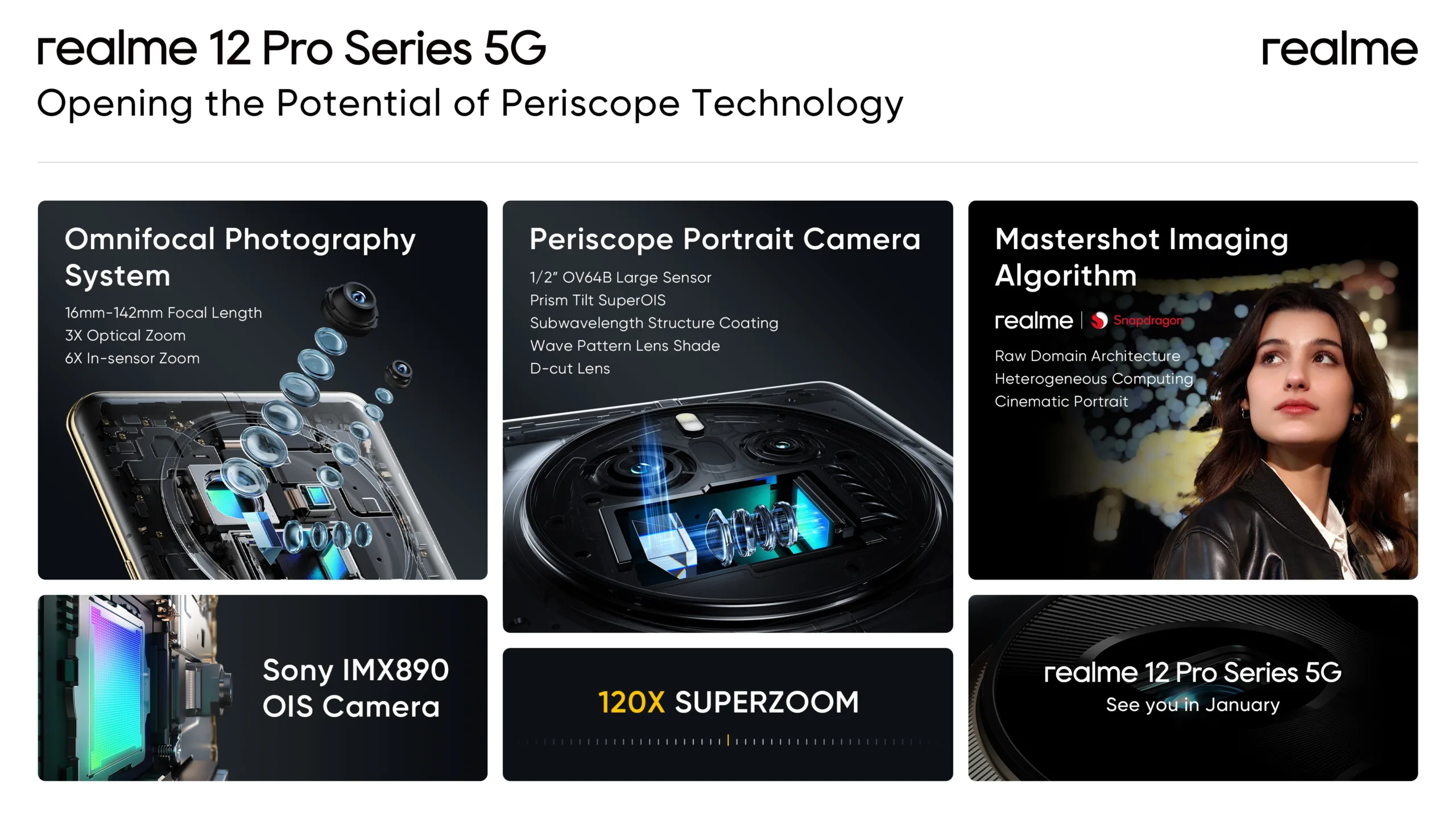 La société chinoise a confirmé plus tôt dans la semaine qu’elle organisera un lancement même pour sa série Realme 12 Pro à la fin du mois de janvier. Le teaser contient également un peu d’informations sur le bloc de caméra des smartphones, mais c’est quelque chose que nous savions déjà.