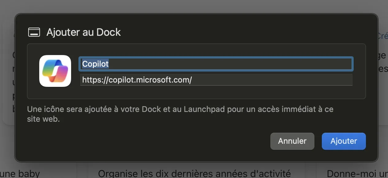 Une icône Copilot sera alors placée dans le Dock. Cliquez dessus pour lancer Copilot en tant qu’application Web.