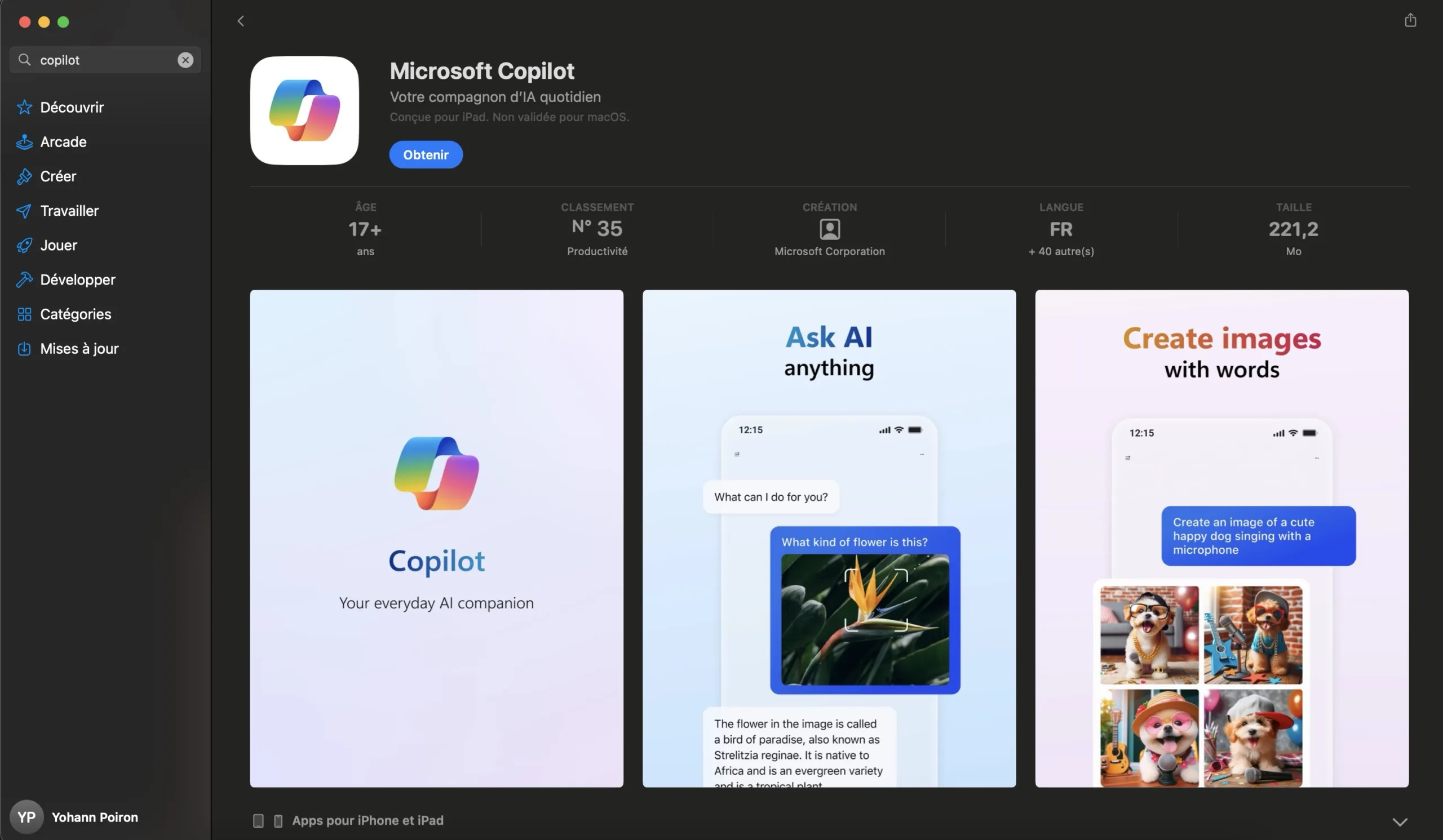 Pour télécharger Microsoft Copilot, ouvrez le lien vers le Mac App Store et cliquez sur « Obtenir ».