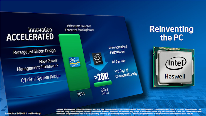 Pour ceux qui l’ignorent, ces nouveaux processeurs à venir d’Intel devraient être lancés au milieu de l’année 2013. Ces puces dits Haswell promettent un coup de pouce de 10% sur la vitesse de traitement et l’amélioration de 50% des performances avec la puce graphique Intel HD Graphics 4000. Non seulement cela, mais les ordinateurs portables disposant de ce processeur de quatrième génération seront beaucoup plus minces (environ 10 mm d’épaisseur) et offriront de manière significative une meilleure autonomie que les modèles actuels (entre 8 à 10 heures).